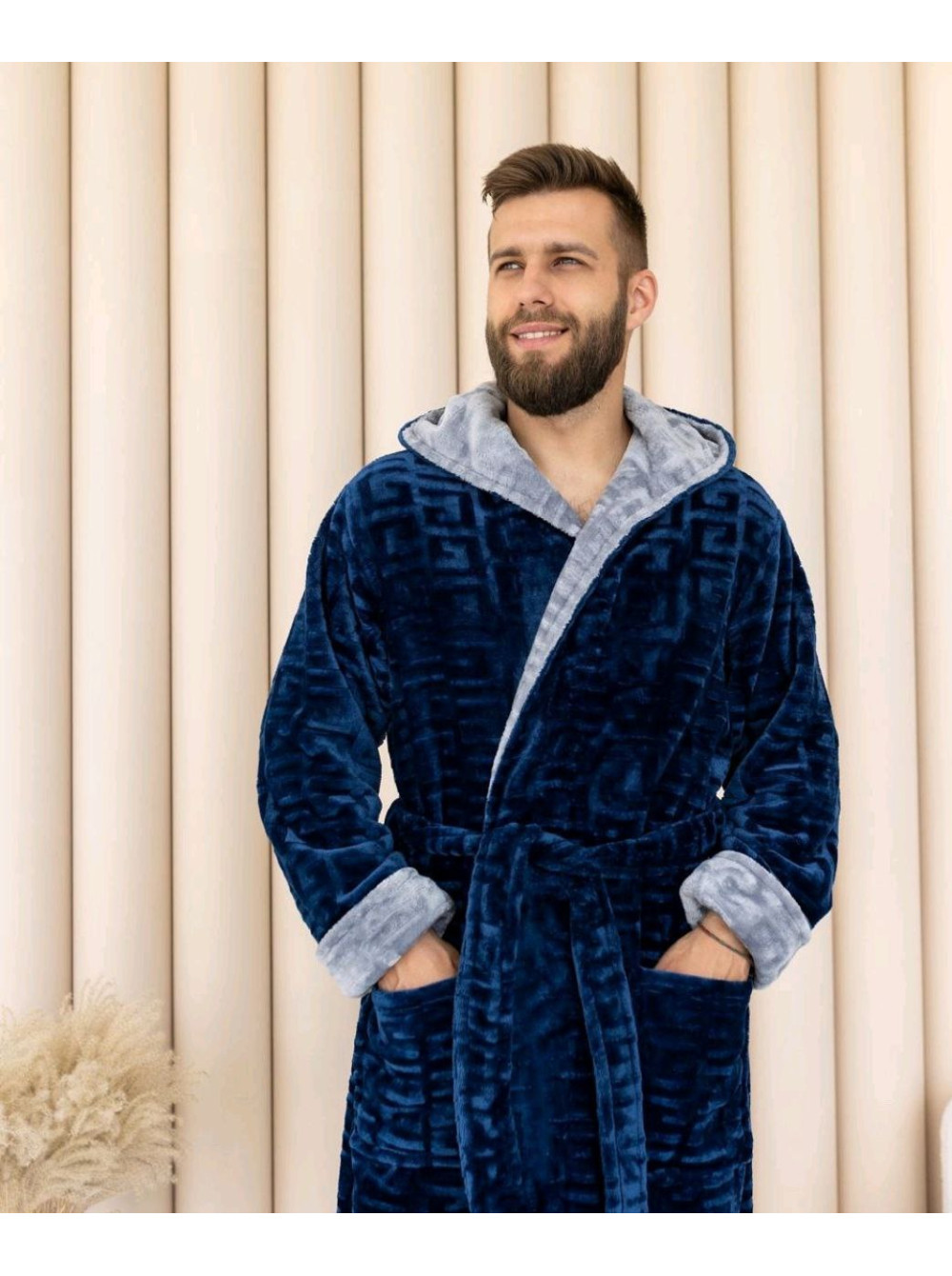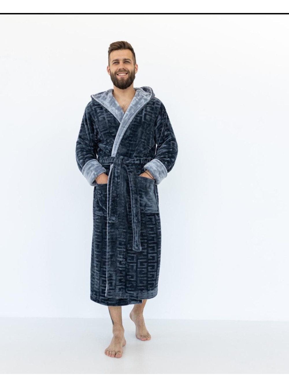 Изделие представляет собой длинный халат большого размера с капюшоном, поясом и карманами.